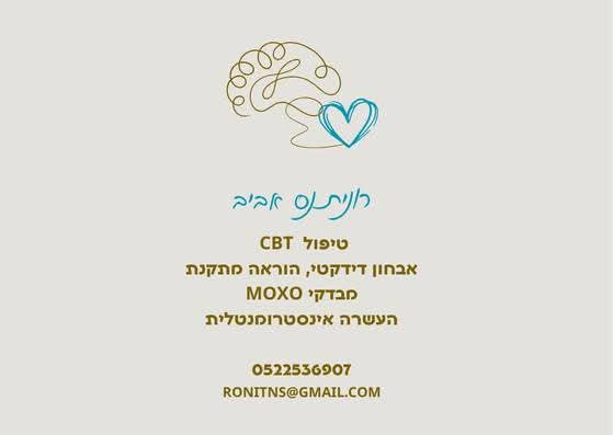 רונית נס אביב פסיכותרפיסטית ומטפלת רגשית cbt, מאבחנת דידקטית ומומחית להוראה מתקנת, עורכת מבדקי MOXO ומטפלת בהעשרה אינסטרומנטלית. בעלת ניסיון רב בעבודה עם ילדים ומתבגרים.